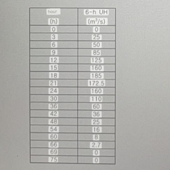 3. Two rainfalls occurred consecutively, each with an hourly rate of 6 hours. Each effective rainfall was found to be 3 cm and 2 cm. A unit diagram with a duration of 6 hours is given in the table below. Find the direct runoff hydrograph (DRH) and graph it.