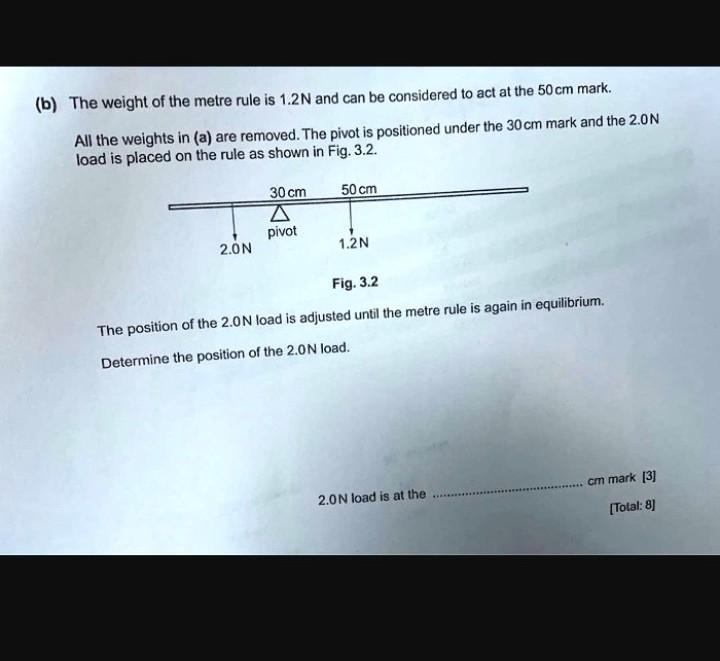 (b) The weight of the metre rule is 1.2N and can be considered to act at the 50 cm mark. All the weights in (a) are removed. The pivot is positioned under the 30 cm mark and the 2.0N load is placed on the rule as shown in Fig. 3.2. 2.0N 30 cm A pivot 50 cm 1.2N Fig. 3.2 The position of the 2.0N load is adjusted until the metre rule is again in equilibrium. Determine the position of the 2.0N load. 2.0N load is at the cm mark [3] [Total: 8]