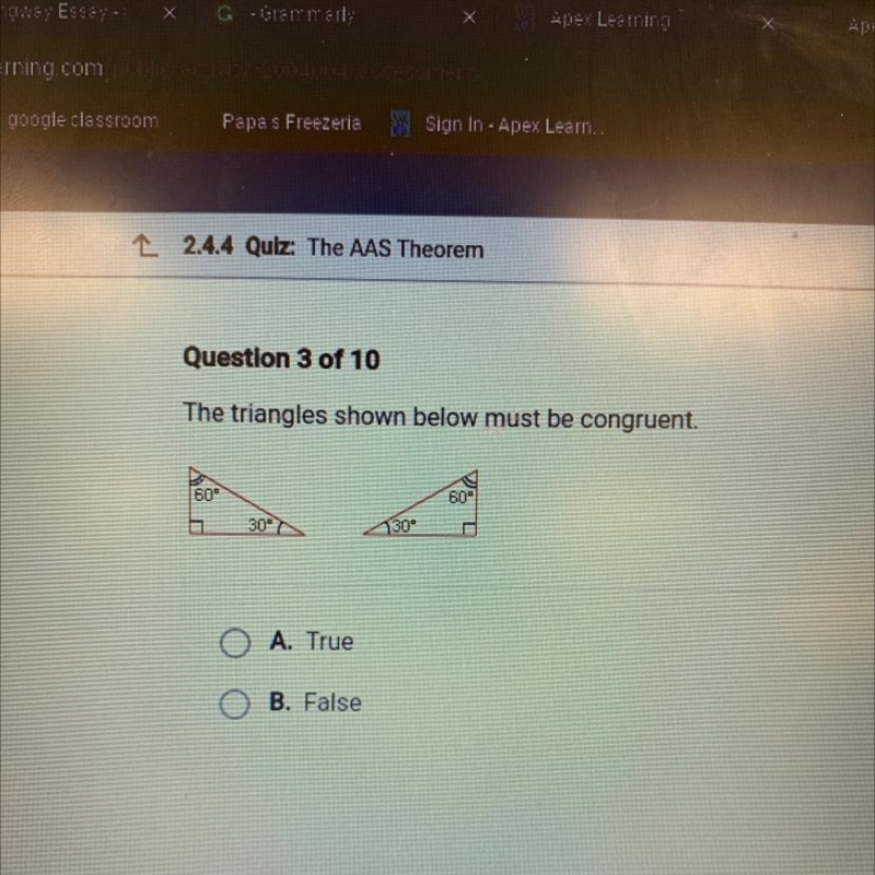 The triangles shown below must be congruent. O A. True OB. False