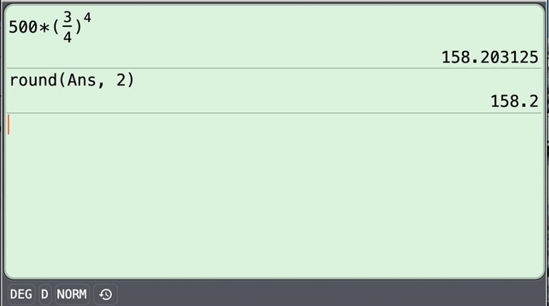 Here, the initial amount is 500 g, the decay factor in an hour is 3/4, and the number of hours is 4:
