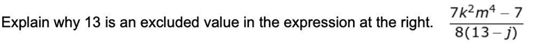 Excluded values are values that will make the denominator of a rational expression equal to 0. If you set j = 13, then the denominator would equal 0. You can't divide by zero.