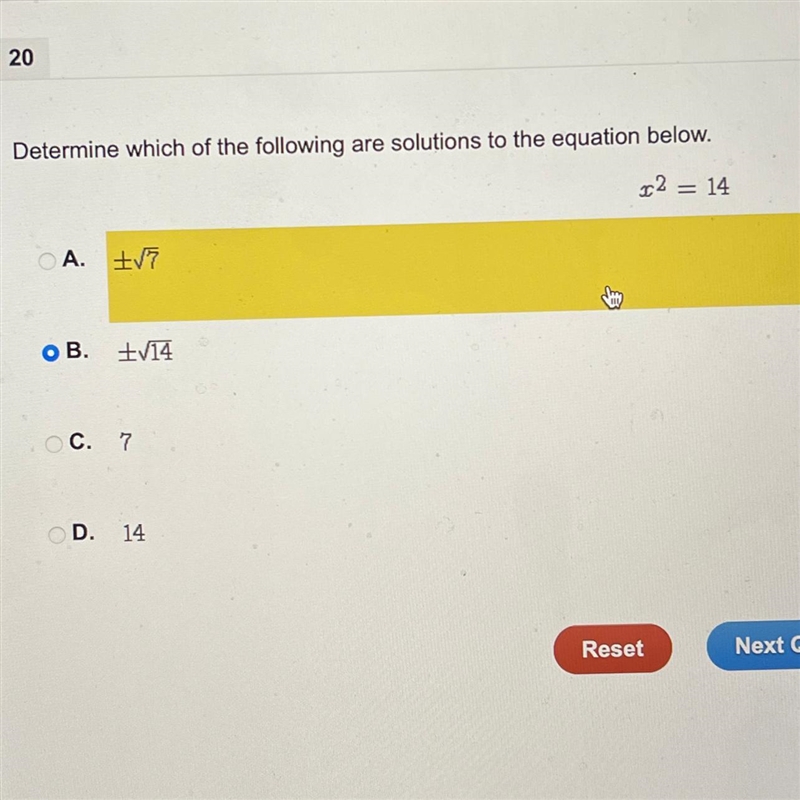 Help asap x^2=14 A /7 B /14 C 7 D14