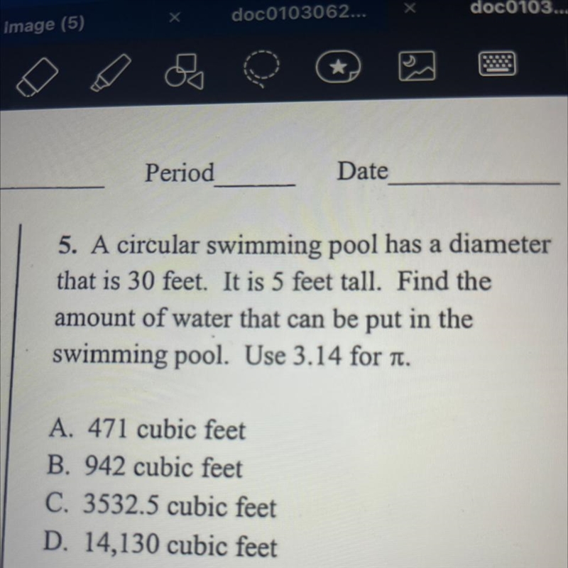 V = πr^2h V = 3.14 x 15^2 x 5 V = 3.14 x 225 x 5 V = 3528.75 cubic feet