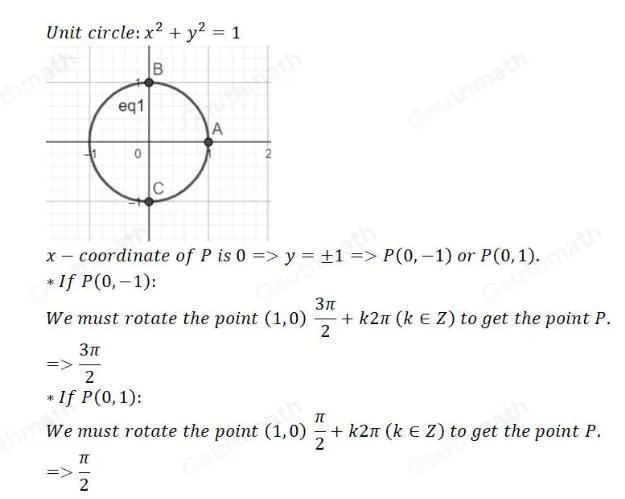The x-coordinate of a point P on the unit circle is 0. If point P is the result of rotating the point (1, 0) by 0 radians counterclockwise about the origin, what angle could rep…