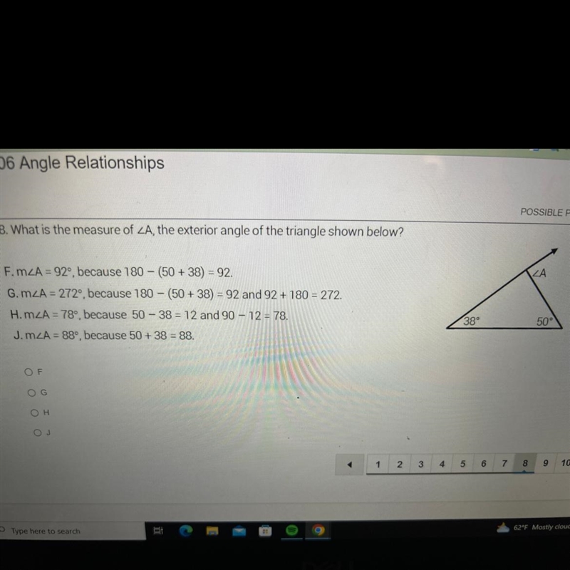 8. What is the measure of 2A, the exterior angle of the triangle shown below?
