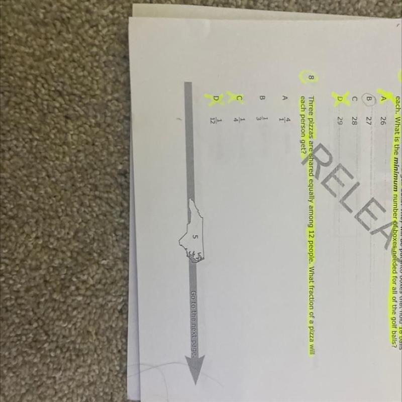 Three pizza are shared equally among 12 people.what fraction of a pizza will each person get? A 4/1 B 3/1