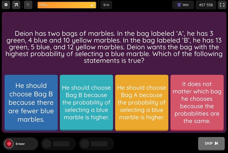 There are seventeen total marbles in bag A, of which four are blue, so label that probability as 4/17. There are twenty-seven marbles in bag B, and five are blue, so label that as 5/27. Based on this, bag A is much more likely to provide a blue marble, so I would go with the yellow answer card, or C.