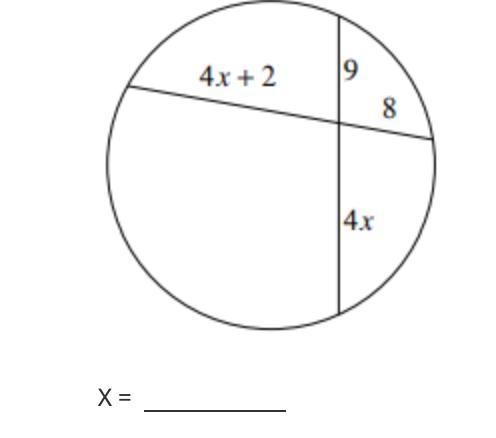 Given two crossing chords, one with segments 9 and 4x, and the other with segments 8 and 4x+2, you want the value of x.
