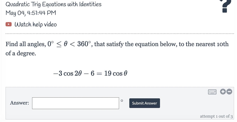 Since -1 ≤ cos θ ≤ 1, there are no angles between 0° and 360° that satisfy the equation to the nearest 10th of a degree. Therefore, the answer is that there are no solutions.