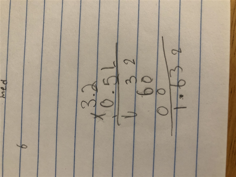 Next, you multiply 3.2 by 0.5, which gives you 1.6. You write this under the line and align the decimal points.