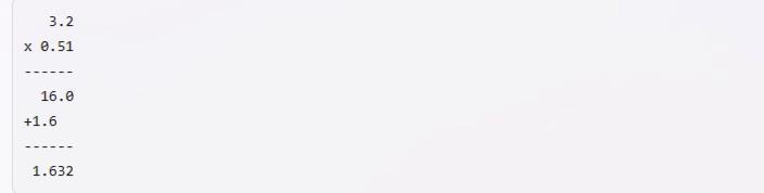 Finally, you count the number of decimal places in both factors: 3.2 has one decimal place and 0.51 has two decimal places, so the product has three decimal places. You move the decimal point three places to the left in the final answer to get 1.632.
