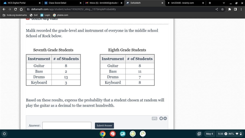 Malik recorded the grade-level and instrument of everyone in the middle school School of Rock below.