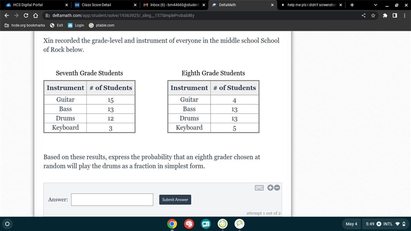 In order to find the probability of a student chosen at random who plays the drums, we have to find how many students play the drums (which we already found) out of the total amount of students there are in that grade/section. Summing up, probability = the amount of favorable cases divided by the amount of possible cases.
