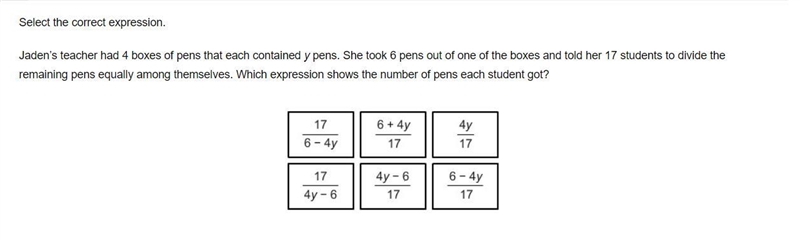 Jaden’s teacher had 4 boxes of pens that each contained y pens. She took 6 pens out of one of the boxes and told her 17 students to divide the remaining pens equally among themselves. Which expression shows the number of pens each student got?