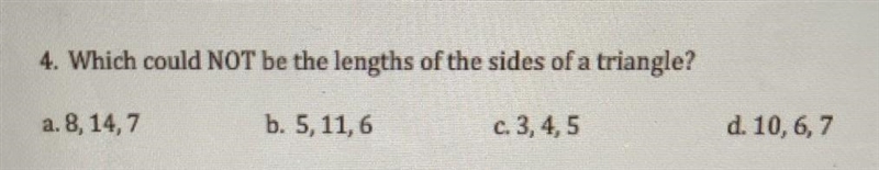 Let the sides of a triangle be a, b, and c, where a < b < c. Then, we know that a + b > c. If we use this identity to solve this problem, then we can find that answer choice b does not satisfy it. Thus, b does NOT have the lengths of a triangle.