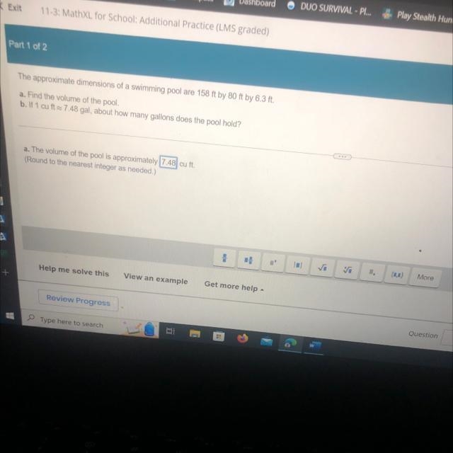The volume of a rectangular prism is length x width x height. We are given the values 158 ft by 80 ft by 6.3 ft. All we do is multiply all 3 values by each other, (158)(80)(6.3). The answer after multiplying is 79632 cubic feet.