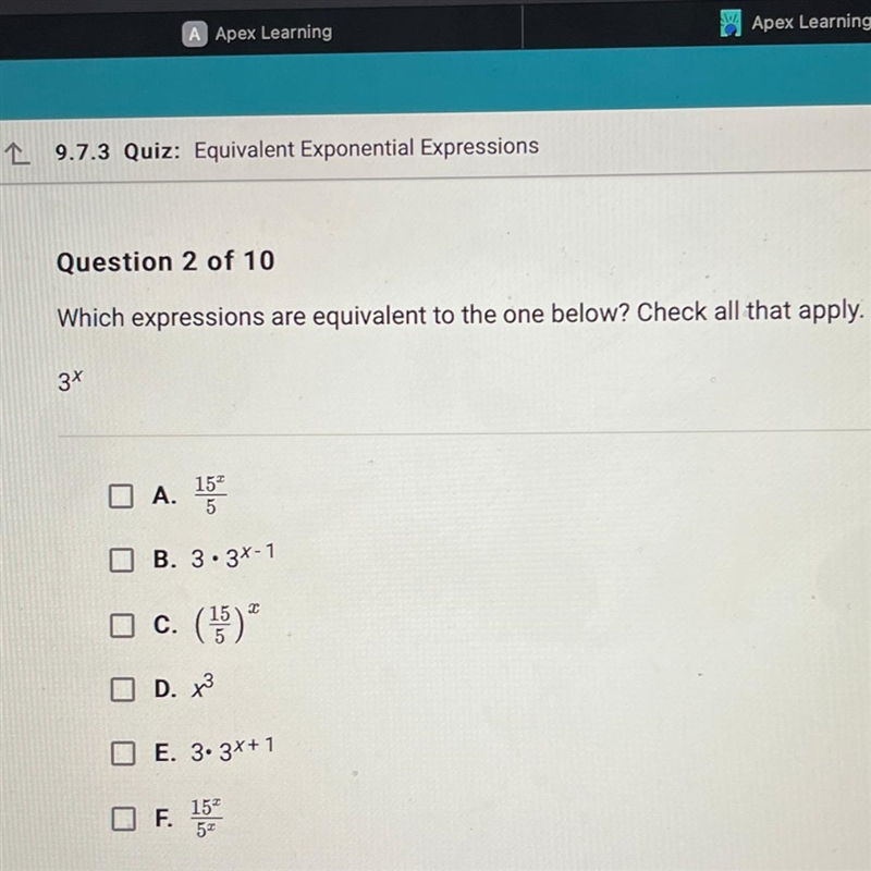 Question 2 of 10 Which expressions are equivalent to the one below? Check all that apply. 3x □ A. 15² B. 3.3X-1 □ C. (¹5) 2 ☐ D. X³ E. 3.3x+1 OF. 15