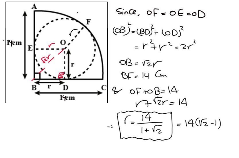 12. The figure below shows a circle centre O, inscribed inside a quadrant centre P and radius 14 cm. Calculate the value of r, radius of the circle.