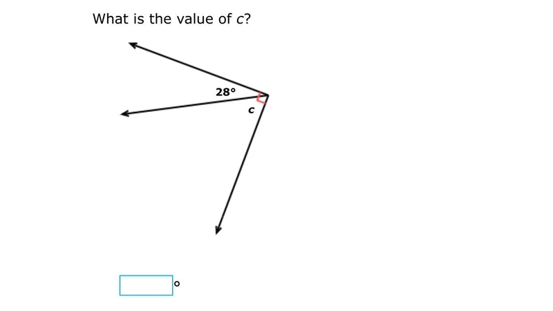Since the total angle is 90° & 28° is taken, then the expression for c° is 90°-28°. And 90-28=62.