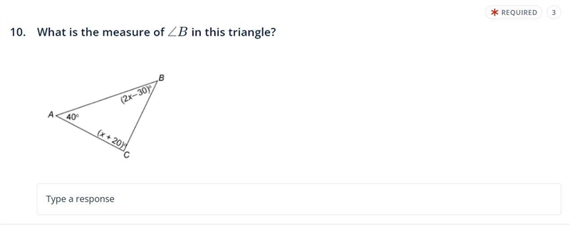 So add up those other 2 angles, set it equal to 140 and solve for x. Then substitute your X back into the provided equation for B. Let's go!