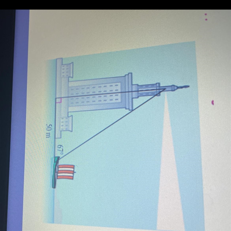 The figure above shows one of the Seven Wonders of the World, the Great Lighthouse at Alexandria, Egypt, whose construction started in 290 B.c. The platform on which the lighthouse stands is about 100 m wide, and the angle of elevation from the corner of the platform to the top of the lighthouse is 67°. To the nearest meter, how high is the lighthouse?