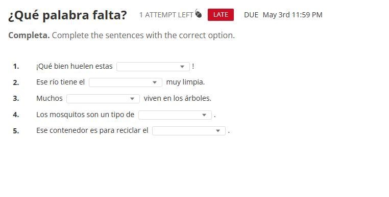 1. flores? 2. agua 3. pajaros? 4. insecto? 5. papel?