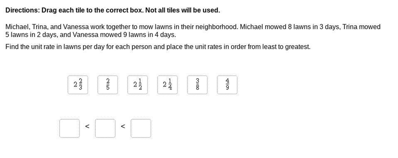 2 1/4 Is less than 2 1/2, 2 1/2 is less then 2 2/3, and 2 2/3 is greater than all of them