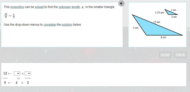 This proportion can be solved to find the unknown length, x , in the smaller triangle. 128=x2