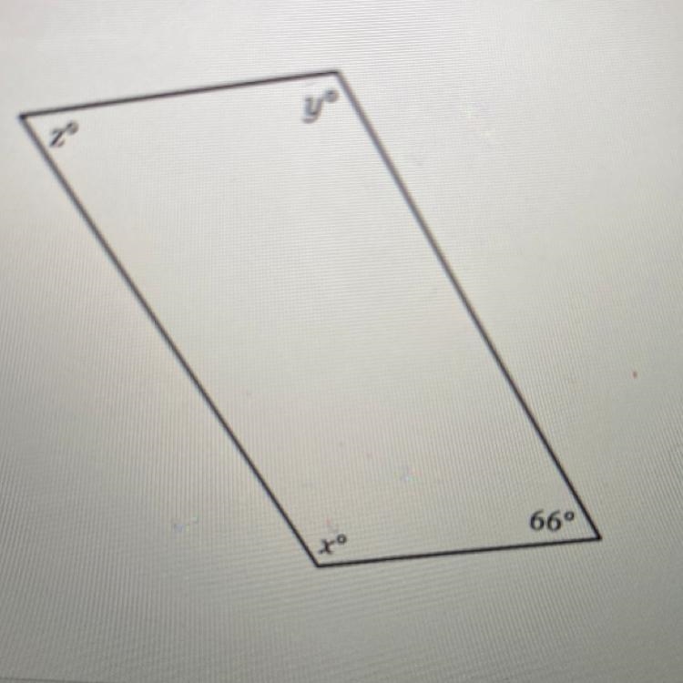 The angle opposite of the angle equal to 66 is also 66. Add these together to get 132. Subtract 132 from 180 to get 48. This is the sum of the two missing angles. Since they are opposites, we know they are equal. Divide 48 by 2 to get 24.