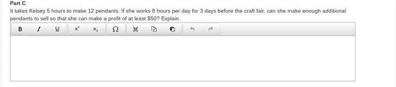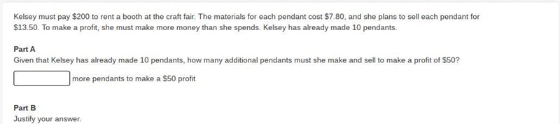 1. Kelsey has to pay $200 to rent a booth at the craft fair. The materials for each pendant cost $7.80, and she plans to sell each pendant for $13.50. To make a profit, she must make more money than she spends. Kelsey has already made 10 pendants.