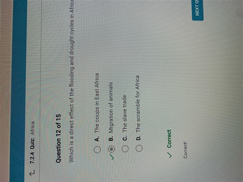 Which is a direct effect of the flooding and drought cycles in Africa? A. The coups in East Africa B. The scramble for Africa C. Migration of animals D. The slave trade