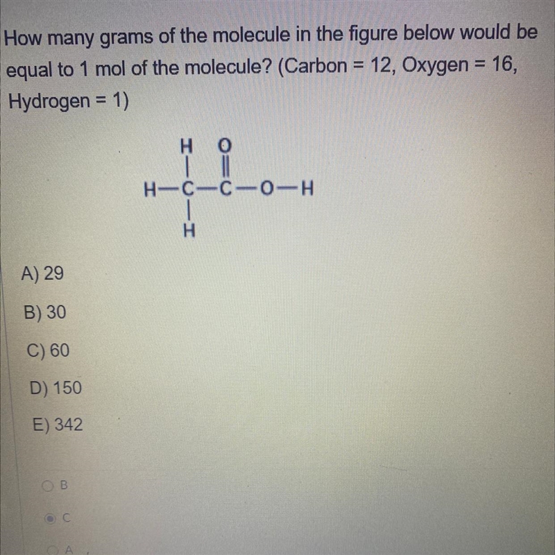 How many grams of the molecule in the figure below would be equal to 1 mol of the molecule? (Carbon = 12, Oxygen = 16, Hydrogen = 1) A) 29 B) 30 C) 60 D) 150 E) 342