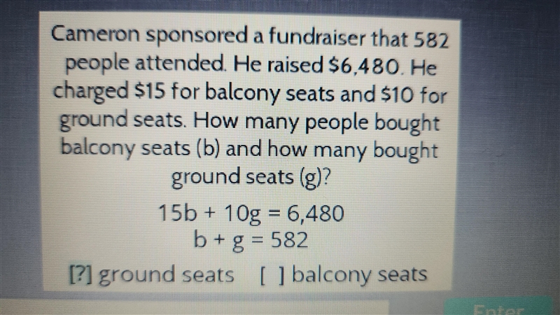 Number of balcony seats (b) = 132 & number of ground seats (g) = 450.