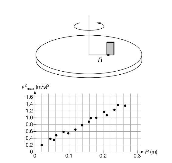 is placed on a disk that rotates about an axle through its center, as shown in the diagram. The block is moved to different distances R from the axle, and the tangential speed of the block is gradually increased until the mass begins to slip. The distance and maximum tangential speed before slipping, vmax, are recorded. A student creates a graph of vmax2 as a function of R, as shown. How should the student use the graph to most accurately determine the experimental value of the coefficient of static friction μS between the block and the disk?