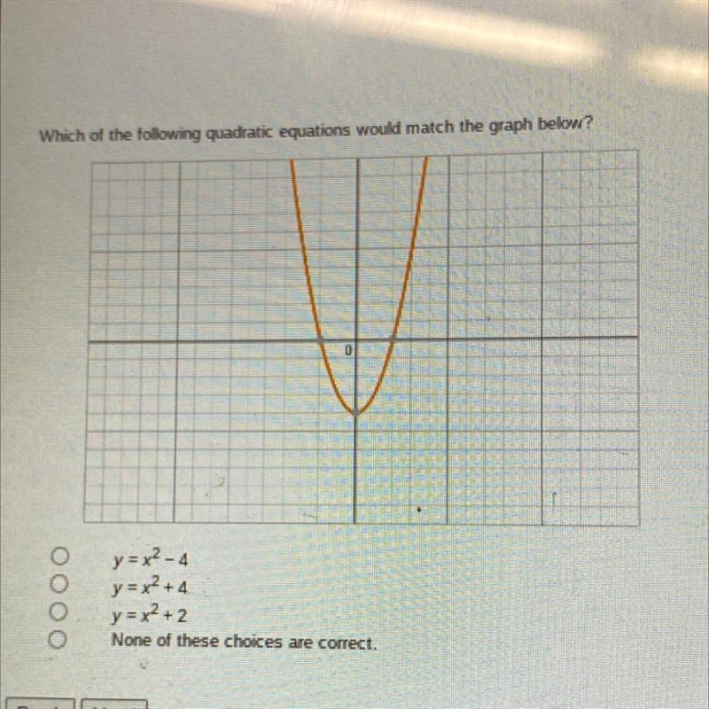 This graph is the reslt of translating y = x^2 down by 4 nits