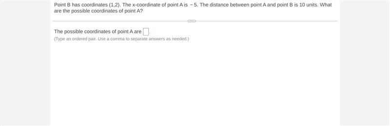 PLEASE HELP ASAP! Point B has the coordinates (1,2). The x-coordinate of Point A is -5. The distance between Point A and Point B is 10 units. What are the possible coordinates o…