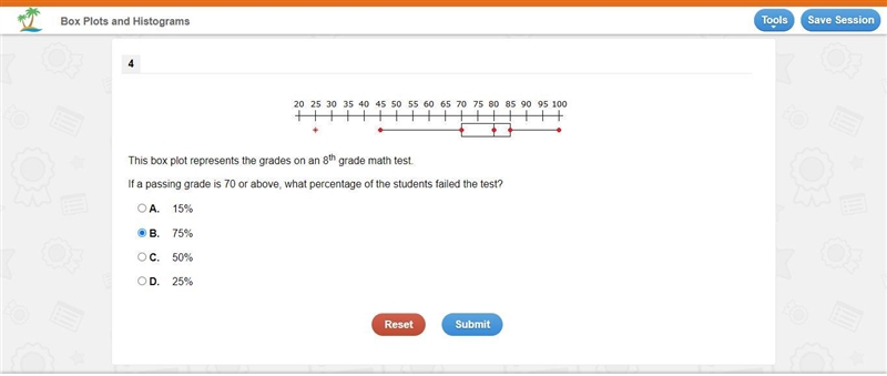 This box plot represents the grades on an 8th grade math test. If a passing grade is 70 or above, what percentage of the students failed the test? A. 15% B. 75% C. 50% D. 25%