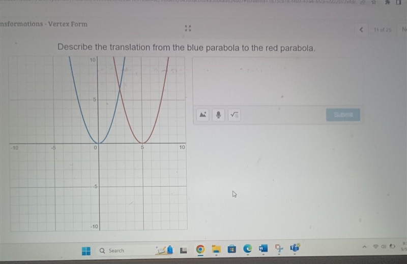 the blue has been translated 5 units to the right (x-axis). no change on y-axis. this translation is (5,0)