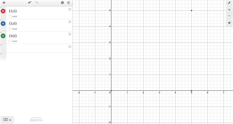 The first side's distance is 5. You can just count those units along the x axis. (0,0) and (5,0) share the same y coordinate, so the difference in x coordinates is 5-0 = 5.
