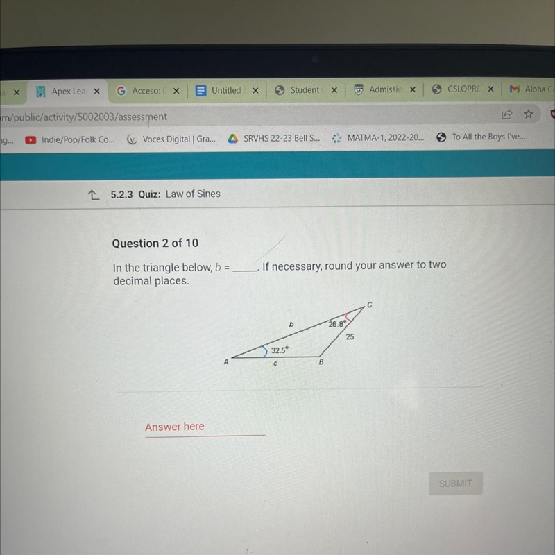 In the triangle below, b =_ If necessary, round your answer to two decimal places. Answer here 32.5° C B 26.8 25 SUBMIT