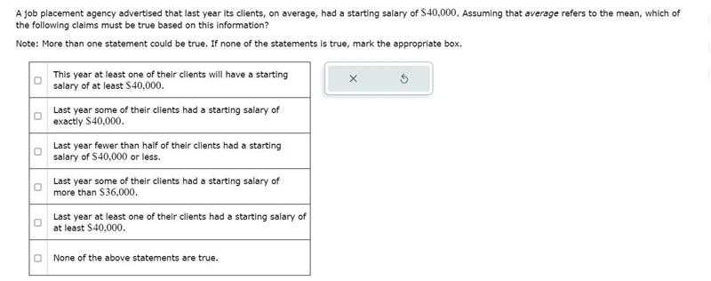 This statement is false. Since the mean starting salary is $40,000, it is impossible for fewer than half of the clients to have had a starting salary of $40,000 or less.