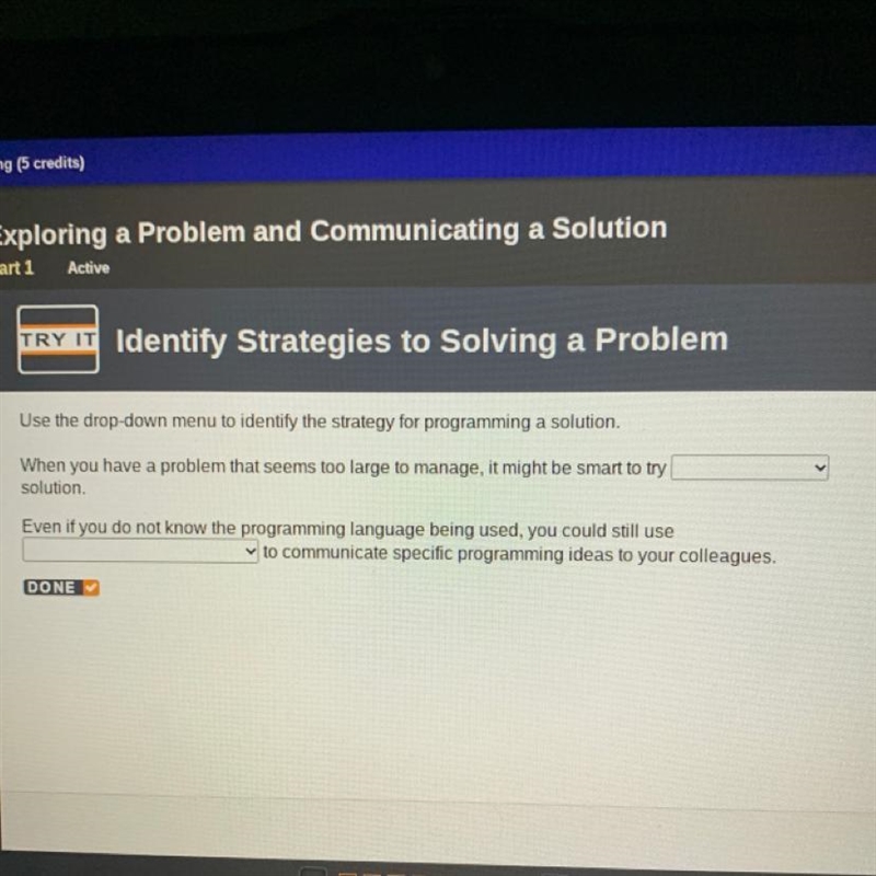 Use the drop-down menu to identify the strategy for programming a solution. When you have a problem that seems too large to manage, it might be smart to try solution. Even if yo…