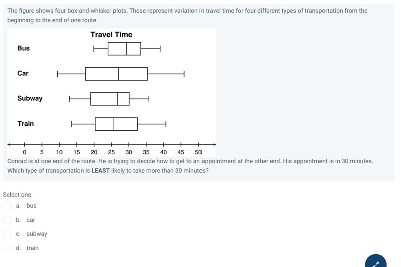 The figure shows four box-and-whisker plots. These represent variation in travel time for four different types of transportation from the beginning to the end of one route. Conr…