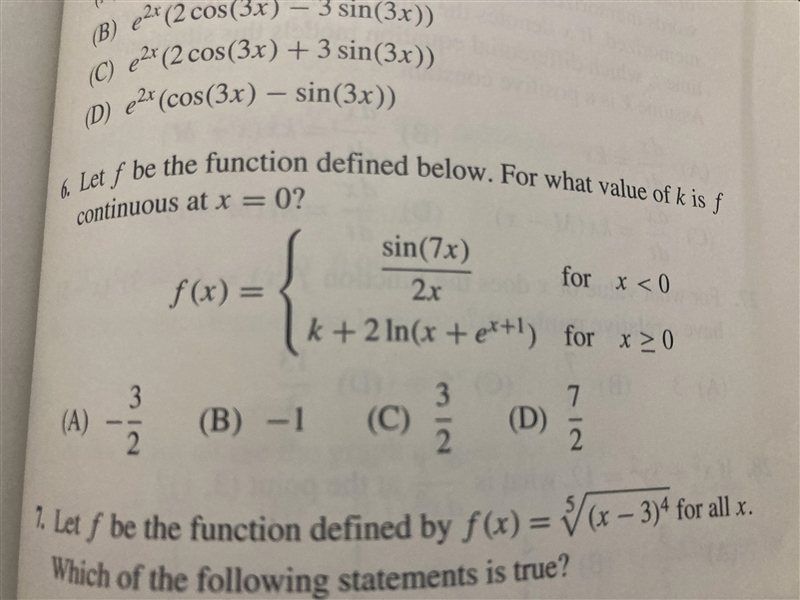 Using that k-value also allows f(0) = 7/2, which makes your function continuous.