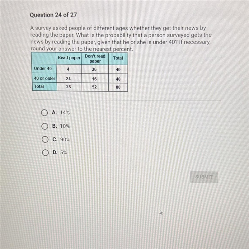 = P(reading paper AND < 40) / P(< 40)