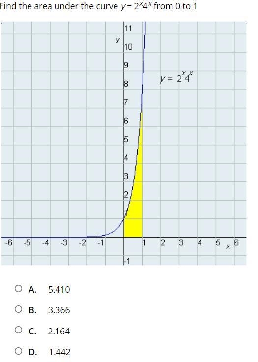 Therefore, the area under the curve y = 2x^4x from 0 to 1 is approximately 1.4427 square units.