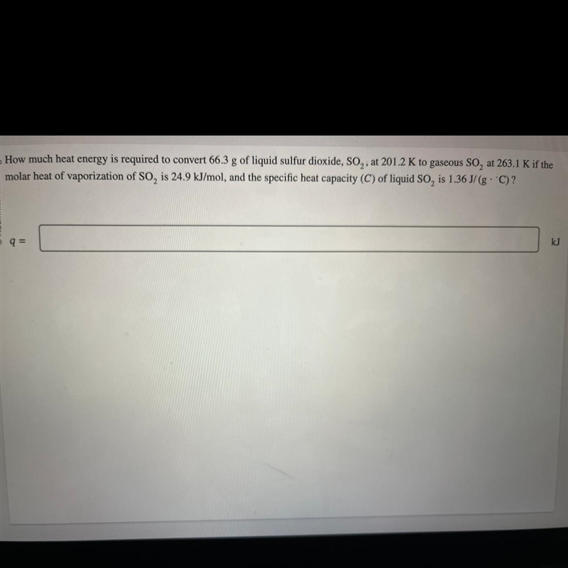 How much heat energy is required to convert 66.3 g of liquid sulfur dioxide, SO2, at 201.2 K to gaseous SO2 at 263.1 K if the molar heat of vaporization of SO2 is 24.9kJ/mol, and the specific heat capacity (C) of liquid SO2 is 1.36J