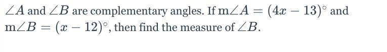 Step 1: Therefore, we can find x by making the sum of the measures of angles A and B equal to 90: