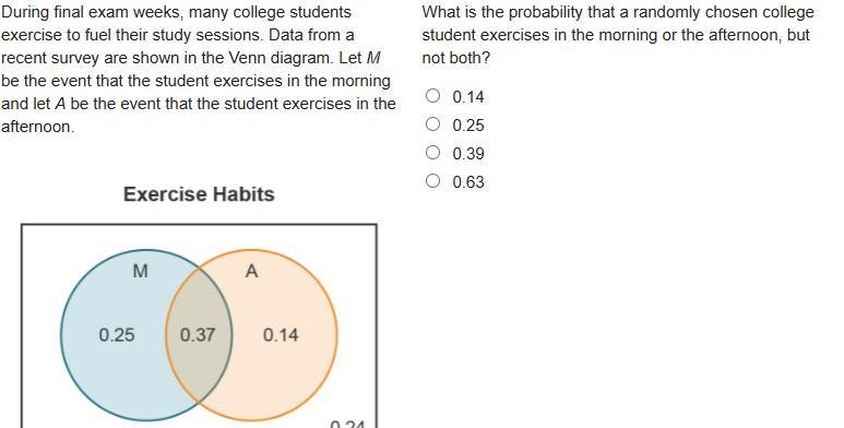 The probability that a randomly chosen college student exercises in the morning or the afternoon, but not both, would be 0.63.