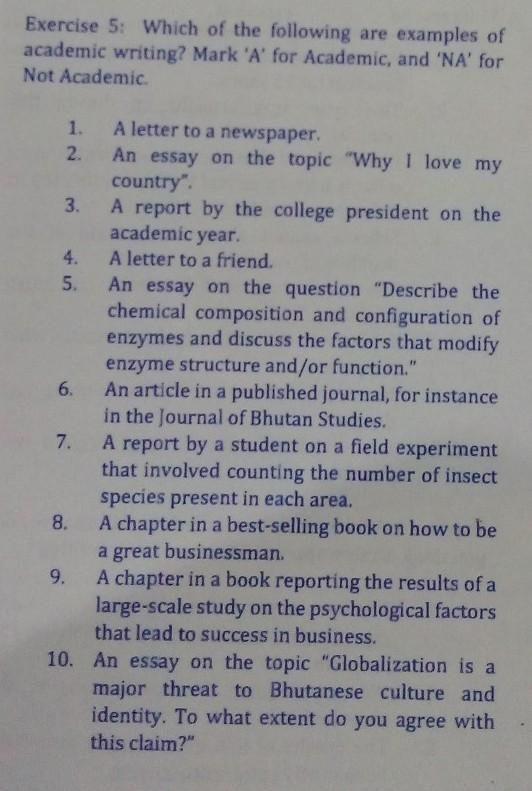 Which of the following are examples of academic writing? Mark ‘A’ for Academic, and ‘NA’ for Not Academic.